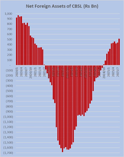 ණය ආපසු ගෙවීමේ ප්රතිඵලයක් ලෙස, මහ බැංකුවේ ශුද්ධ විදේශ වත්කම් රුපියල් බිලියන 222.1 සිට රුපියල් බිලියන 514.8 දක්වා රුපියල් බිලියන 292.7කින් ඉහළ ගොස් තිබෙනවා. මෙයින් රුපියල් බිලියන 90.6ක් වැඩි වී තිබෙන්නේ ජූලි සහ අගෝස්තු මාස දෙක ඇතුළතයි.