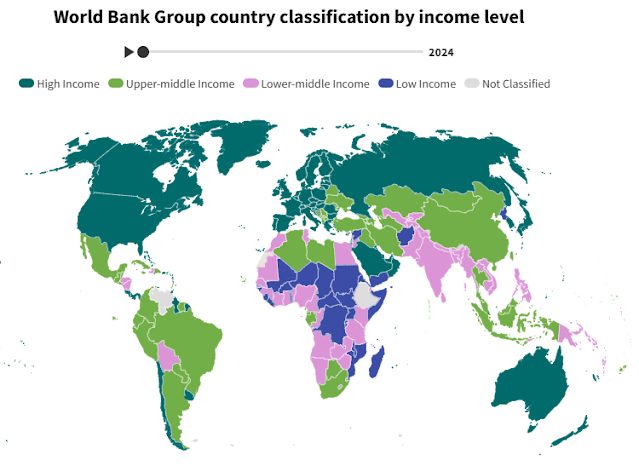 ඉන් පසුව, වාර්ෂිකව, ලෝක බැංකුව විසින් මෙම වර්ගීකරණය සිදු කරනවා. එසේ වර්ගීකරණය කරද්දී, උද්ධමනය නිසා මුදලේ වටිනාකම වෙනස් වීම සැලකිල්ලට ගනිමින්, කාණ්ඩ වෙන් කරන අගයයන් යාවත්කාලීන කරනවා. ඉන් පසුව, පෙර වර්ෂයේදී එක් එක් රටේ ඒක පුද්ගල දළ ජාතික නිෂ්පාදිතය මත පදනම්ව රටවල් කාණ්ඩ වලට වෙන් කරනවා. පසුගිය වසරේදී රටවල් වර්ග කළේ පහත ආකාරයෙනුයි.