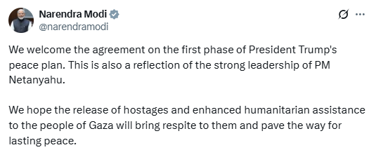 Prime Minister Narendra Modi on Thursday welcomed US President Donald Trump’s announcement of Israel and Hamas agreeing to the first phase of his 20-point Gaza peace plan, calling it a "reflection of the strong leadership of Israeli Prime Minister Benjamin Netanyahu". In a post on X, PM Modi expressed hope that the release of hostages and increased humanitarian assistance would bring relief to the people of Gaza and pave the way for lasting peace.